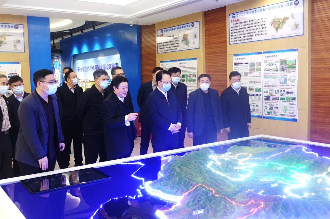 在“黑土糧倉”科技會戰(zhàn)指揮中心,東北地理所所長姜明介紹了科技會戰(zhàn)核心技術(shù)攻關(guān)和區(qū)域適宜性模式示范組織框架以及黑土地保護(hù)與利用國家重點實驗室籌建模式。景俊海觀看了“黑土糧倉”科技會戰(zhàn)沙盤和指揮控制平臺演示,要求及時總結(jié)推廣黑土地保護(hù)工作的好經(jīng)驗好做法,促進(jìn)我省黑土地質(zhì)量整體提升。
