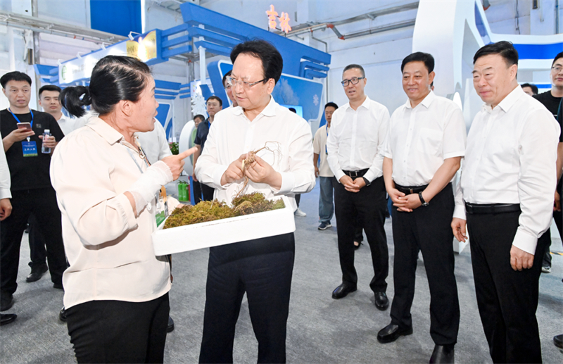 7月22日,省委書記景俊海,省委副書記、省長胡玉亭在農產品展示區(qū)與參展商親切交流。鄒乃碩 攝
