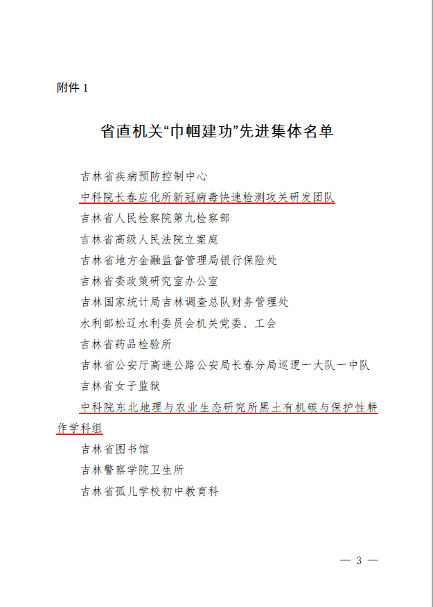 近日,吉林省直婦工委對(duì)吉林省直機(jī)關(guān)“巾幗建功”先進(jìn)集體和先進(jìn)個(gè)人進(jìn)行了表彰,在受表彰的15個(gè)“巾幗建功”先進(jìn)集體中,中科院長春分院組織推薦的“長春應(yīng)化所新冠病毒快速檢測(cè)攻關(guān)研發(fā)團(tuán)隊(duì)”和“東北地理所黑土有機(jī)碳與保護(hù)性耕作學(xué)科組”2個(gè)集體均被授予吉林省直機(jī)關(guān)“巾幗建功”先進(jìn)集體榮譽(yù)。