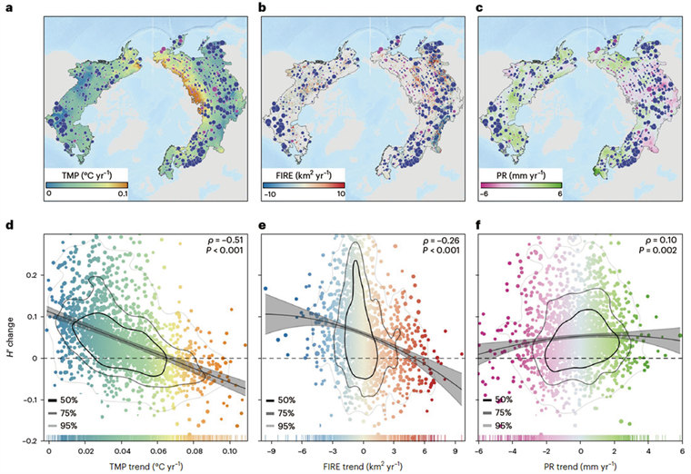 研究發(fā)現(xiàn)自2000年以來(lái),北方森林的樹(shù)種多樣性(以香農(nóng)多樣性指數(shù)H'表示)平均增加了12%;樹(shù)種多樣性對(duì)氣溫升高表現(xiàn)出積極響應(yīng),但隨著溫度變化的加劇,這種關(guān)系逐漸減弱。在極端升溫地區(qū)(溫度增加超過(guò)0.065°C/年),樹(shù)種多樣性受到了負(fù)面影響。此外,該研究還發(fā)現(xiàn),多樣性的增加與北方森林生物量的生產(chǎn)力和時(shí)間穩(wěn)定性的增加顯著相關(guān)。這表明,氣候變暖驅(qū)動(dòng)的樹(shù)種多樣性增加對(duì)北方生態(tài)系統(tǒng)的功能具有積極影響,但在極端升溫地區(qū),這種趨勢(shì)被逆轉(zhuǎn)。本研究通過(guò)模型模擬量化了氣候變化背景下樹(shù)種多樣性的時(shí)空演變及其對(duì)碳循環(huán)的影響,研究結(jié)果能夠?yàn)橹贫▍^(qū)域性的氣候適應(yīng)策略提供重要的數(shù)據(jù)支持,并有助于預(yù)測(cè)和應(yīng)對(duì)未來(lái)極端氣候?qū)ι稚鷳B(tài)系統(tǒng)的影響。