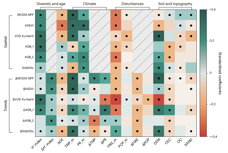 (記者 閆東潔)樹(shù)種多樣性在維持森林生態(tài)系統(tǒng)功能尤其作為重要碳匯方面發(fā)揮著關(guān)鍵作用。過(guò)去三十年,由于氣候變化和二氧化碳濃度的上升導(dǎo)致了區(qū)域間的森林動(dòng)態(tài)失衡(如生長(zhǎng)或死亡),全球森林面積經(jīng)歷了顯著變化,但大尺度上森林樹(shù)種多樣性對(duì)氣候變化的響應(yīng)仍不清楚。