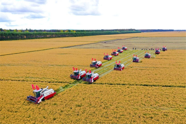 ↑這是9月27日在位于雙鴨山市友誼縣的北大荒農(nóng)業(yè)股份有限公司友誼分公司拍攝的秋收現(xiàn)場(chǎng)(無(wú)人機(jī)照片)。新華社記者 石楓 攝