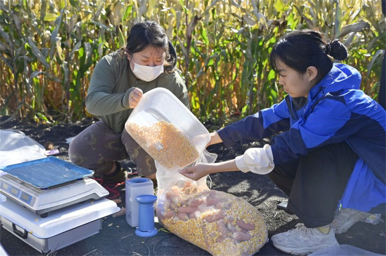 ↑9月29日,在位于佳木斯市樺南縣的曙光農(nóng)場(chǎng),研究人員記錄當(dāng)季收獲玉米籽粒的重量和含水量。新華社記者 石楓 攝