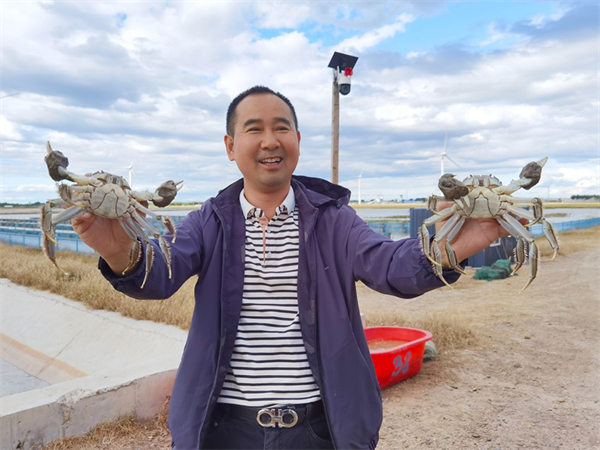 手握肥嫩嫩江大閘蟹,蟹鉗勁足,滿是豐收喜悅。