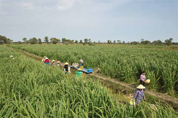 翠綠的茭白田,工作人員忙著采收茭白,臉上洋溢著豐收的喜悅。