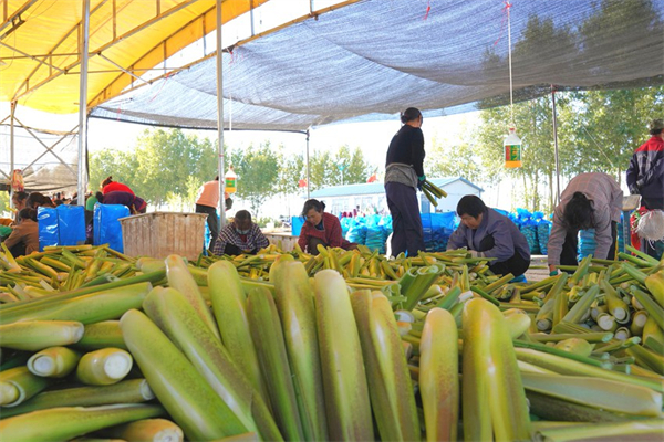 剛采收的茭白,工作人員忙著分揀分級(jí)。