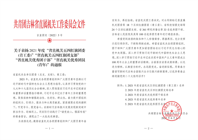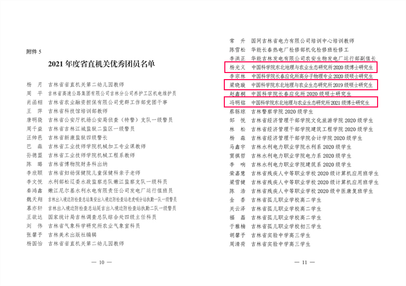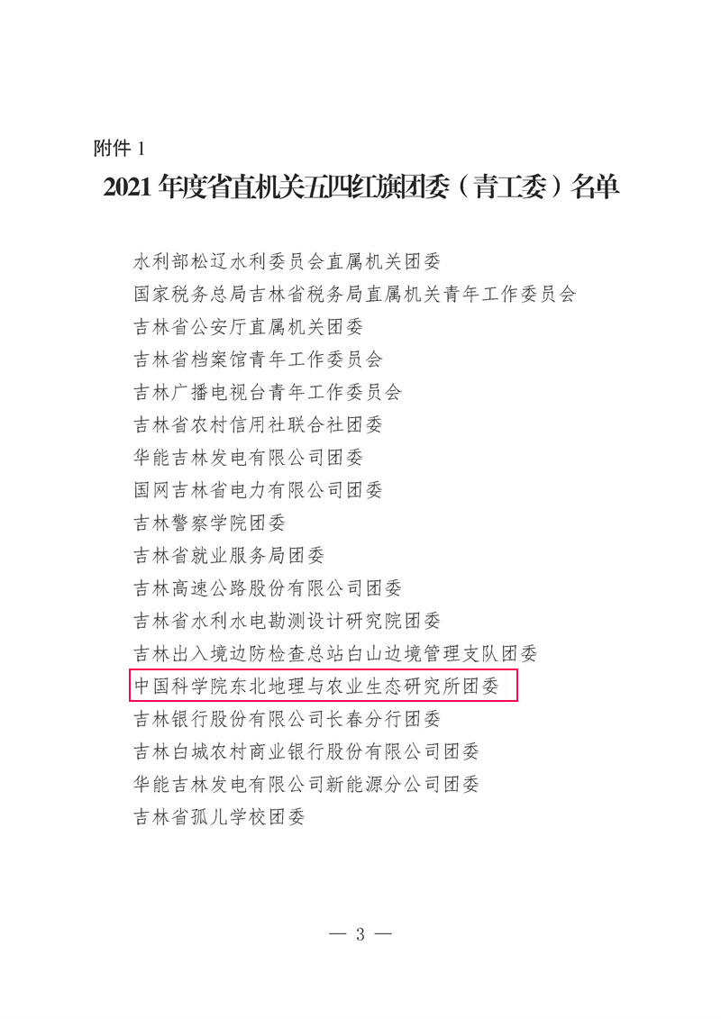 為表?yè)P(yáng)先進(jìn),激勵(lì)團(tuán)青組織和廣大團(tuán)員青年奮發(fā)有為、再創(chuàng)佳績(jī),省直機(jī)關(guān)團(tuán)工委對(duì)18個(gè)五四紅旗團(tuán)委(青工委)、24個(gè)五四紅旗團(tuán)支部、33名優(yōu)秀團(tuán)干部、100名優(yōu)秀團(tuán)員青年進(jìn)行通報(bào)表?yè)P(yáng)。中國(guó)科學(xué)院東北地理與農(nóng)業(yè)生態(tài)研究所團(tuán)委榮獲“2021年度省直機(jī)關(guān)五四紅旗團(tuán)委”稱(chēng)號(hào),2020級(jí)博士研究生楊光義、2019級(jí)碩士研究生梁曉璇、2021級(jí)博士研究生馮明銘榮獲“省直機(jī)關(guān)優(yōu)秀團(tuán)員”稱(chēng)號(hào)。