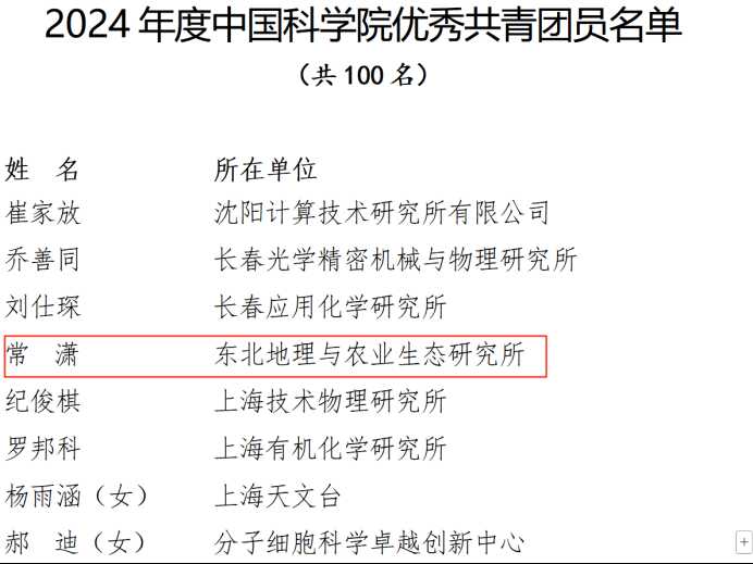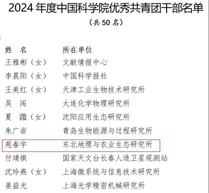 為表彰先進、樹立典型,激勵團青組織和廣大團員、團干部奮勇爭先、再創(chuàng)佳績。近日,中國科學院團委發(fā)文對29個五四紅旗團委、30個五四紅旗團支部、50名優(yōu)秀共青團干部、100名優(yōu)秀團員青年進行表彰。中國科學院東北地理與農(nóng)業(yè)生態(tài)研究所團委書記苑春宇榮獲“2024年度優(yōu)秀共青團干部”稱號、2023級博士研究生常瀟榮獲“2024年度中國科學院優(yōu)秀共青團員”稱號。