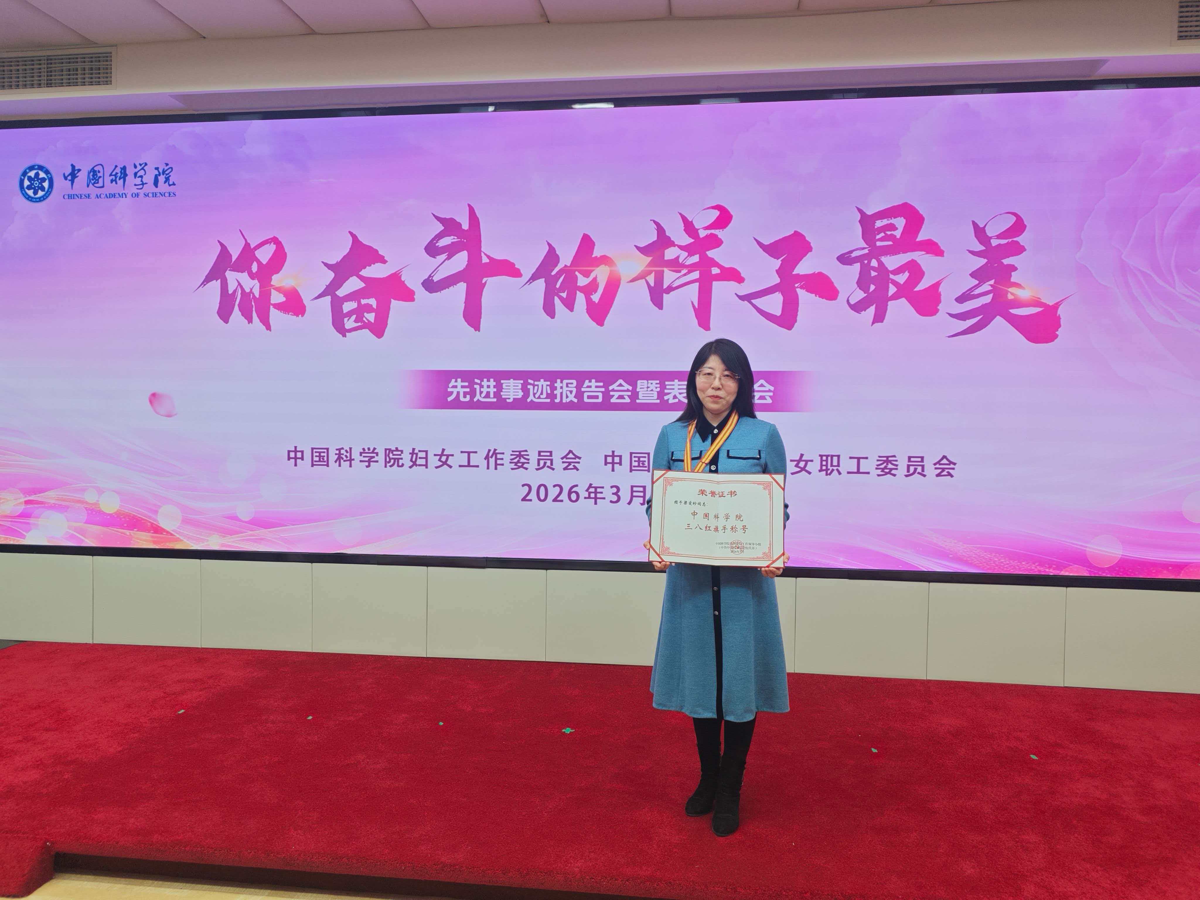 為選樹先進典型,激勵引領(lǐng)全院廣大女干部職工積極投身科技創(chuàng)新,努力為建設(shè)世界科技強國作出貢獻,在2026年“三八”國際勞動婦女節(jié)來臨之際,3月5日上午,中國科學(xué)院婦女工作委員會、中國科學(xué)院工會女職工委員會舉辦“你奮斗的樣子最美”先進事跡報告會暨表彰大會。大會表彰了15名“中國科學(xué)院三八紅旗手”和5個“中國科學(xué)院三八紅旗集體”。我所梁愛珍研究員榮獲第三屆“中國科學(xué)院三八紅旗手”榮譽稱號。