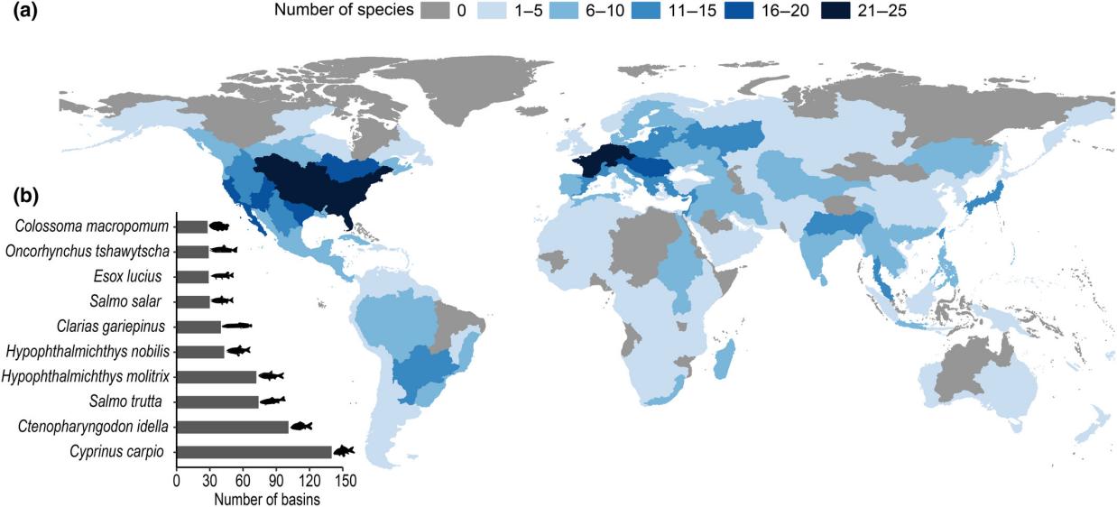 圖3(a)全球各主要流域(level-3 HydroBASINS)外來淡水大型魚類物種數(shù)量;(b)最被廣泛引入的 10 種外來大型魚類。