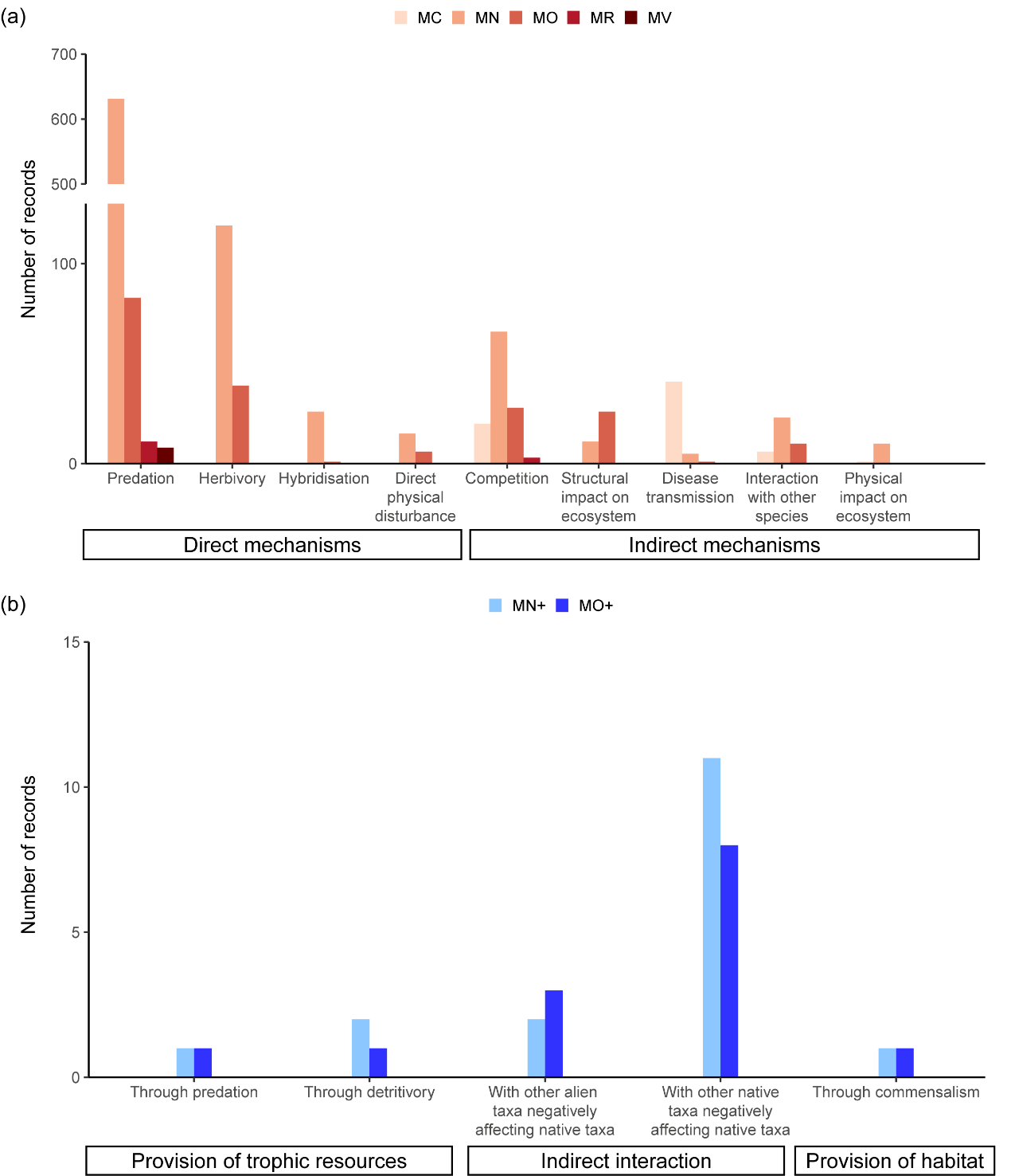 圖4 基于EICAT和EICAT+框架評估的各外來淡水大型魚類物種對本土物種的影響機制。MC/ML+:無明顯影響;MN/MN+:個體適合度下降或增加;MO/MO+:種群數(shù)量減少或增加;MR:種群滅絕但該效應(yīng)在外來物種被清除后可逆;MV:種群永久性滅絕。