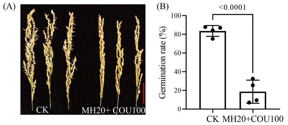 研究團隊通過連續和短期浸種實驗,從馬來酰肼(MH)、香豆素(COU)和丁香酚(EUG)三種穗發芽抑制劑中篩選出穗發芽抑制劑的最佳組合為MH 20 mg L-1 + COU 100 mg L-1,該組合可顯著降低水稻種子發芽率。進一步研究表明,該組合處理顯著降低了種子萌發過程中的α-淀粉酶活性,減少了可溶性糖和可溶性蛋白的含量,從而抑制了種子萌發所需的能量和物質供應。該組合還能調節抗氧化酶活性,抑制活性氧(ROS)的積累,減少MDA的產生;促進種子內ABA含量快速積累(圖1)?;虮磉_分析表明,MH和COU組合通過調節OsNCED1/2/5和OsABA8ox1-3表達,精準調節水稻種子內ABA的含量。在不同萌發階段,該組合對ROS產生基因OsRbohs表達的調節不同,還下調了α-淀粉酶基因(OsAmy1A和OsAmy3D)的表達。體外模擬萌發試驗進一步證實該PHS抑制劑組合能夠有效降低種子萌發(圖2)。