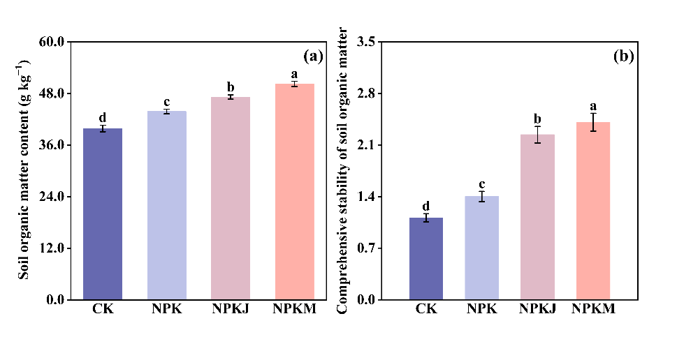 圖2 不同施肥措施對土壤有機(jī)質(zhì)含量以及綜合穩(wěn)定性的影響