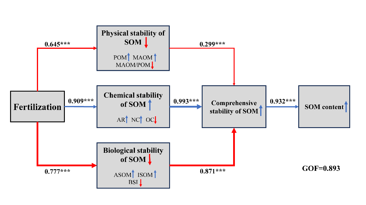 研究發(fā)現(xiàn),與不施肥相比,施肥措施主要促進(jìn)了具有較高活性的POM含量的增加,其中有機(jī)物料的施用效果顯著優(yōu)于單一施用化肥,但施肥后降低了MAOM/POM,進(jìn)而降低了SOM的物理穩(wěn)定性。另外,長期施肥顯著增加了SOM中的芳香化合物、含氮化合物和含硅化合物等穩(wěn)定成分的含量,提高了SOM的化學(xué)穩(wěn)定性。而針對SOM的生物穩(wěn)定性,施肥主要促進(jìn)了SOM中可礦化有機(jī)質(zhì)(ASOM)的形成,提高了SOM的礦化速率常數(shù),降低了SOM的BSI,從而降低了SOM的生物穩(wěn)定性(圖1)。不同施肥措施主要通過提高SOM的化學(xué)穩(wěn)定性而提高了SOM的綜合穩(wěn)定性,而SOM穩(wěn)定性的變化直接影響了SOM的含量(圖2、圖3)。研究結(jié)果證明,施肥可以提高SOM的綜合穩(wěn)定性,且化肥配施秸稈和化肥配施有機(jī)肥的效果明顯優(yōu)于單施化肥。本研究為長期不同施肥管理下SOM穩(wěn)定性變化及其固存機(jī)制提供了科學(xué)依據(jù)。