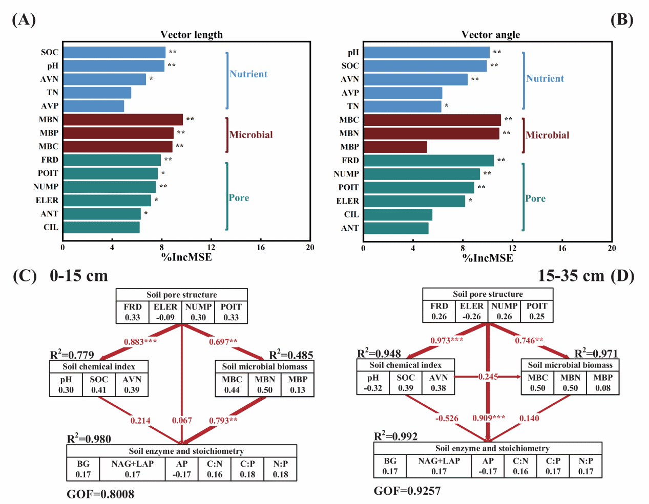 圖2. 土壤性質(zhì)對酶活性的影響和微生物資源限制與土壤性質(zhì)的關(guān)系