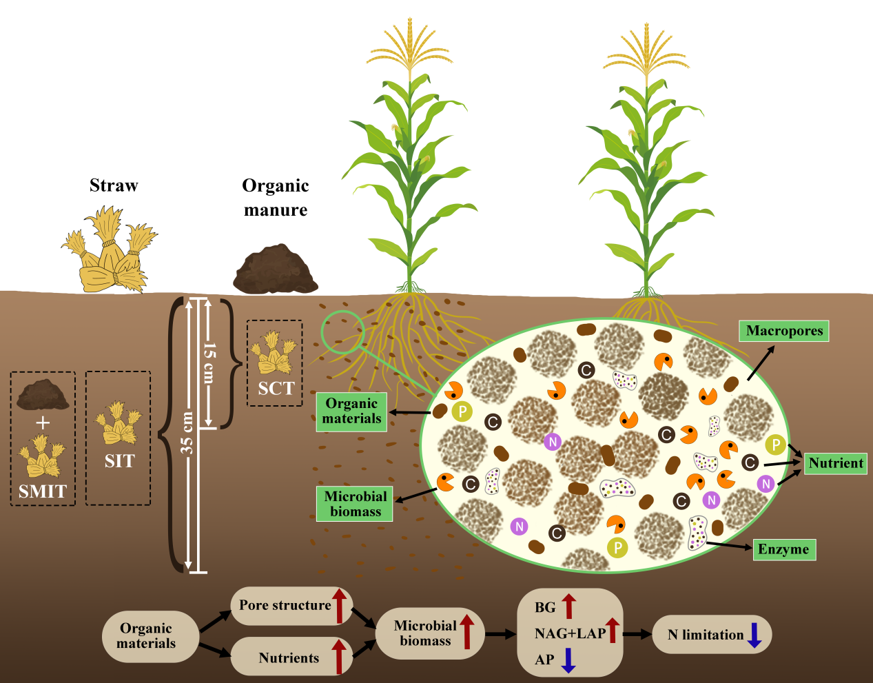 東北地理所黑土保護與利用學科組研究人員在黑鈣土地區(qū)通過有機物料還田與耕作深度結(jié)合的定位試驗,探究了有機物料類型與還田深度對土壤孔隙結(jié)構(gòu)和土壤酶活性的影響,并分析了土壤結(jié)構(gòu)特征對微生物量和微生物活性的影響機制,旨在為改善土壤孔隙結(jié)構(gòu)和微生物活性進而增加農(nóng)田生態(tài)系統(tǒng)中碳氮的固存提供科學的見解。