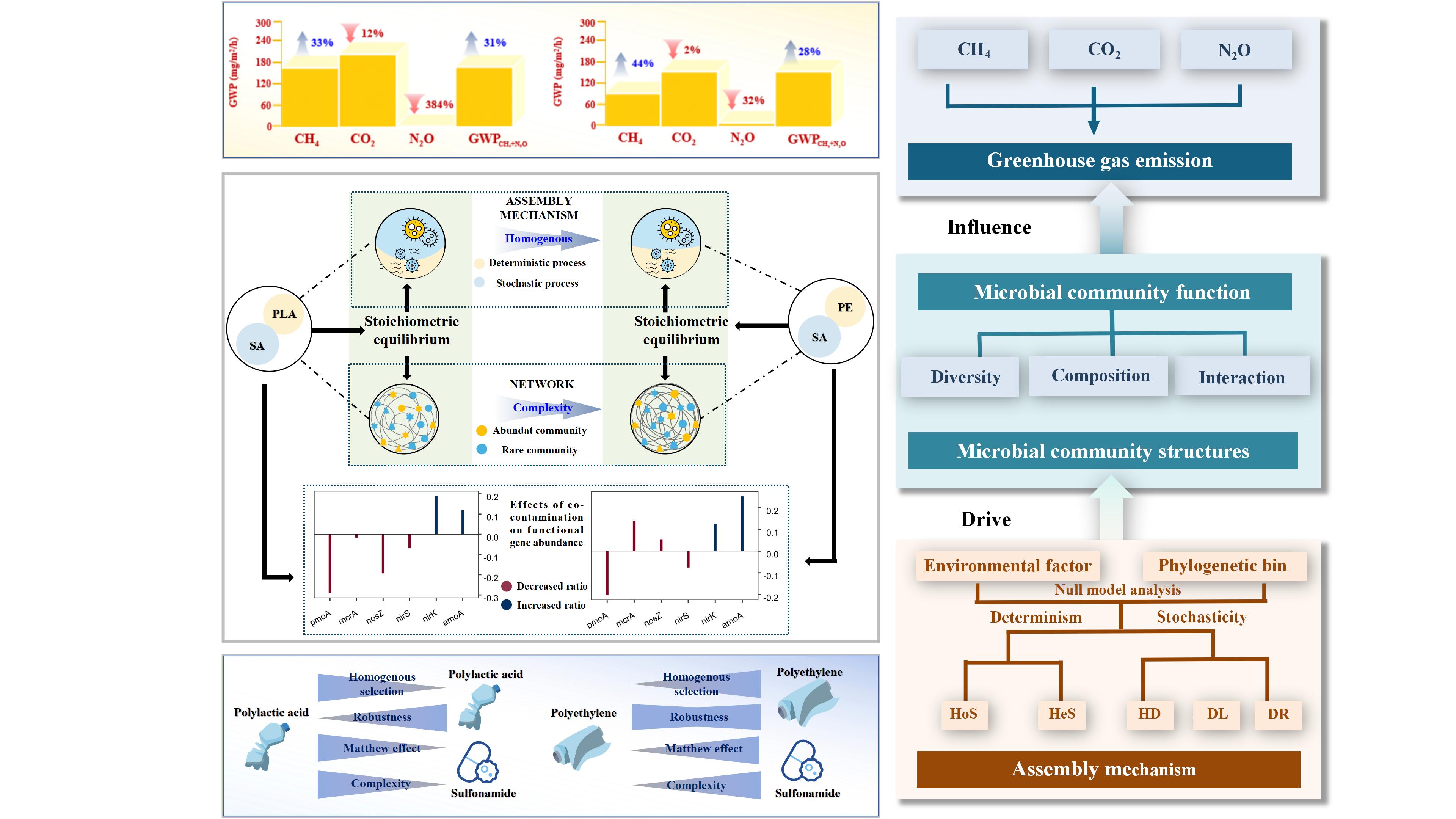 為解決上述問題,中國科學(xué)院東北地理與農(nóng)業(yè)生態(tài)研究所水環(huán)境污染與防治研究團(tuán)隊通過微宇宙模擬實驗,探究了不同微塑料(傳統(tǒng)微塑料聚乙烯(PE)、可生物降解微塑料聚乳酸(PLA))和磺胺類抗生素(SA)在單一暴露以及復(fù)合暴露條件下,對農(nóng)業(yè)溝渠沉積物溫室氣體(CH4、CO2和N2O)排放特征的影響,并初步揭示了其潛在的微生物學(xué)機制。研究結(jié)果顯示,不同處理下溝渠沉積物全球增溫潛勢值(GWP)依次為:SA+PLA (162.96 mg/m2/h) > PLA (123.49 mg/m2/h) > SA (121.75 mg/m2/h) > SA+PE (102.33 mg/m2/h) > CK (84.67 mg/m2/h) > PE (78.29 mg/m2/h)。這一研究結(jié)果證明SA與PLA的復(fù)合污染將導(dǎo)致溝渠沉積物溫室效應(yīng)加劇。微生物組裝和分子生態(tài)網(wǎng)絡(luò)分析表明,SA引起的選擇性壓力降低了沉積物中群落組分更替,而微塑料則增強了漂移過程的相對重要性,并降低了微生物網(wǎng)絡(luò)的魯棒性。由于SA和PLA的復(fù)合污染促進(jìn)了稀有物種的定殖,其對微生物網(wǎng)絡(luò)和組裝過程的影響與SA和PE復(fù)合污染的結(jié)果相反。