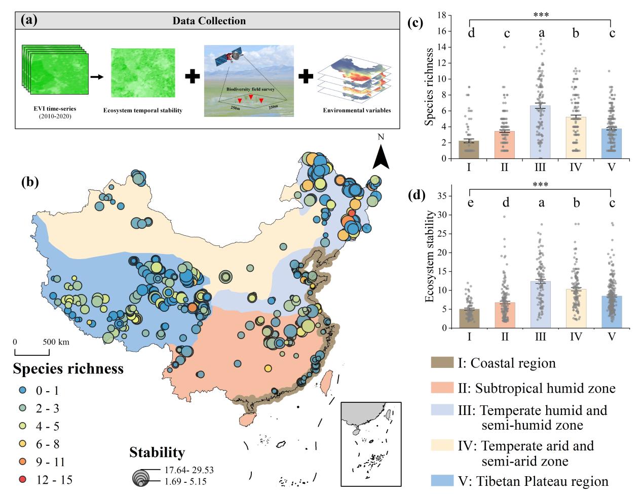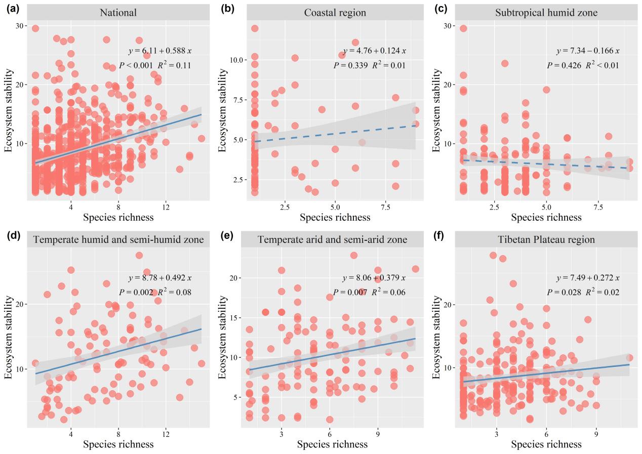 圖2 中國(guó)國(guó)家尺度和不同氣候區(qū)物種豐富度與濕地生態(tài)系統(tǒng)穩(wěn)定性之間的關(guān)系