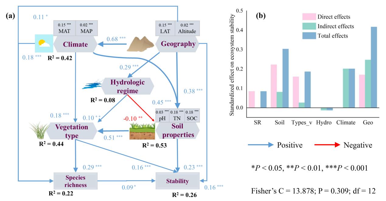 圖3 結(jié)構(gòu)方程模型揭示生物和非生物因素對(duì)中國(guó)草本濕地生態(tài)系統(tǒng)穩(wěn)定性的驅(qū)動(dòng)機(jī)制