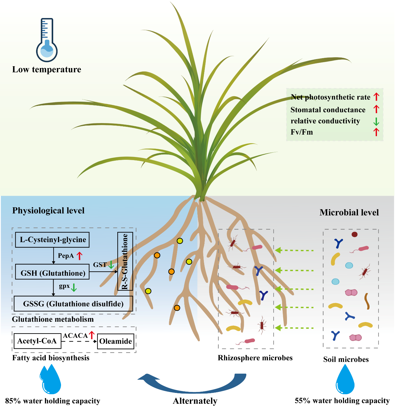 低溫導致作物植株細胞膜通透性改變、限制光合碳同化能力,對作物生產造成極大影響。根際微生物通過代謝調節(jié)、細菌細胞外多糖產生、抗氧化防御和促進根系生長等方式幫助作物應對環(huán)境脅迫。分根區(qū)干旱灌溉已被廣泛用于調節(jié)作物根系發(fā)育和緩解環(huán)境脅迫,但現有的研究主要關注干旱和鹽脅迫下作物的生理機制,對灌溉誘導的根系代謝和根際微生物組的改變如何促進低溫抗性的見解有限。