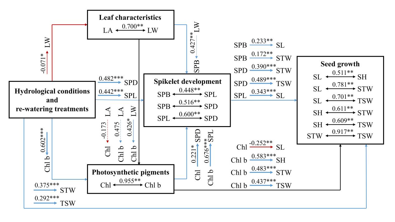 研究結(jié)果表明,初始水文條件和分時(shí)補(bǔ)水措施顯著影響了瘤囊薹草的小穗發(fā)育、種子生長(zhǎng)、葉片發(fā)育以及光合色素積累。相較于其他處理,濕潤(rùn)條件結(jié)合第15天補(bǔ)水至初始水文狀態(tài)的水文情勢(shì)顯著增強(qiáng)了瘤囊薹草小穗發(fā)育特征、種子生長(zhǎng)特性,且葉片生態(tài)特征及葉綠素含量均高于其他處理?xiàng)l件。此外,小穗發(fā)育特征和種子生長(zhǎng)性狀與葉片生態(tài)特征和葉綠素含量表現(xiàn)出顯著的相關(guān)性。在驅(qū)動(dòng)機(jī)制方面,水文條件及補(bǔ)水情境直接影響了瘤囊薹草的小穗發(fā)育和種子生長(zhǎng),同時(shí)還通過(guò)調(diào)控葉片寬度和葉綠素b含量從而間接影響小穗發(fā)育過(guò)程和隨后的種子生長(zhǎng)活動(dòng)。總體而言,精準(zhǔn)補(bǔ)水措施通過(guò)多種途徑顯著影響瘤囊薹草的小穗發(fā)育和種子生長(zhǎng)。結(jié)合半干旱區(qū)氣候特征及農(nóng)業(yè)發(fā)展?fàn)顩r,實(shí)施洪水和融雪水資源集約化利用以及農(nóng)業(yè)-生態(tài)水資源共管可作為半干旱地區(qū)高效利用水資源的關(guān)鍵策略。