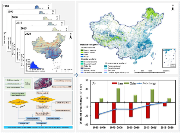 圖1 基于Landsat時間序列大數據的China_Wetlands數據集構建及主要結果