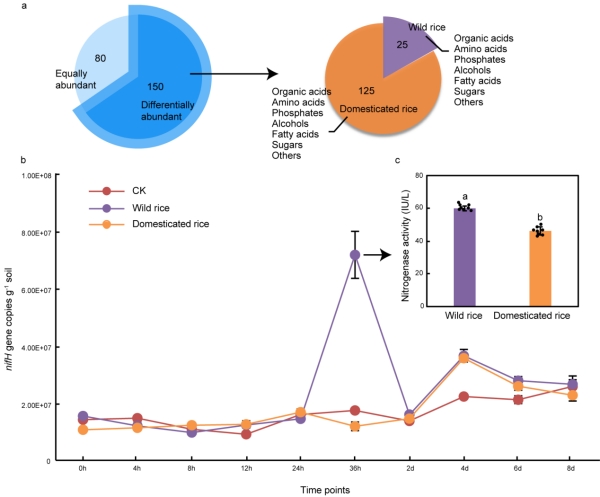 栽培稻的根際微生物組中與氧化亞氮(N?O)生成相關(guān)基因數(shù)量顯著增加。通過田間測量N?O排放量發(fā)現(xiàn),栽培稻土壤中的N?O排放量顯著高于野生稻。為解析水稻馴化對根際氮循環(huán)微生物組的調(diào)控機(jī)制,研究人員系統(tǒng)比較野生稻和栽培稻根系代謝組,發(fā)現(xiàn)野生稻根系分泌物與微生物固氮基因豐度呈正相關(guān)。進(jìn)一步實(shí)驗(yàn)表明,向黑土中添加野生稻根系代謝物,可以顯著增加土壤微生物固氮基因豐度和固氮酶活性。