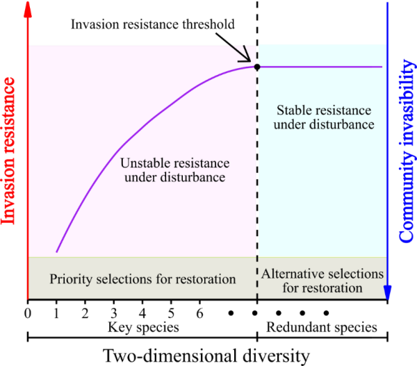 圖2 兩維度多樣性對本地群落入侵抵抗力的可能作用。當本地群落達到入侵抵抗力閾值后,繼續增加兩維度多樣性不會增加入侵抵抗力。在達到這個閾值前,系統的入侵抵抗力在干擾下不穩定,并且重要物種的喪失會降低入侵抵抗力