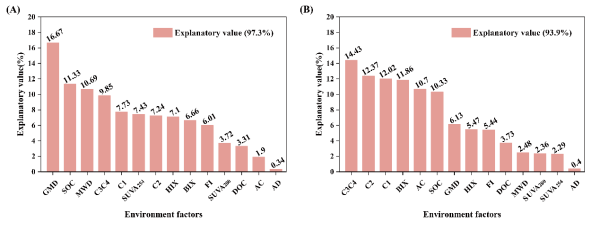 圖1 0-20 cm (A)和20-40 cm (B)土層環(huán)境因子對(duì)大豆產(chǎn)量的影響