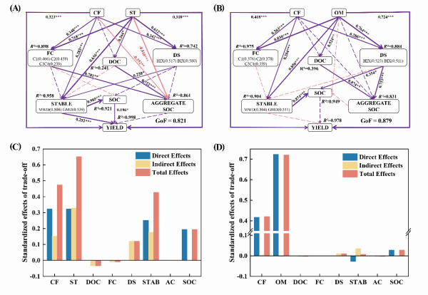 東北地理所黑土保護(hù)與利用學(xué)科組研究人員基于中國科學(xué)院海倫農(nóng)業(yè)生態(tài)實(shí)驗(yàn)站的34年長期定位試驗(yàn),系統(tǒng)研究了有機(jī)物料施用對(duì)0–20 cm和20–40 cm土層團(tuán)聚體粒徑分布、DOM特性、有機(jī)碳(SOC)含量及作物產(chǎn)量的影響。研究結(jié)果表明,有機(jī)物料施用顯著增加了>0.25 mm團(tuán)聚體比例和團(tuán)聚體內(nèi)SOC含量,提升了DOM濃度,并促進(jìn)了腐殖化程度和生物有效性。DOM組成變化通過增強(qiáng)團(tuán)聚體穩(wěn)定性,進(jìn)而增加了土壤中SOC的固存。研究發(fā)現(xiàn)了不同有機(jī)物料施用對(duì)作物產(chǎn)量影響的過程(圖1),其中,秸稈還田主要通過改善團(tuán)聚體結(jié)構(gòu)從而促進(jìn)作物產(chǎn)量的增加,而有機(jī)肥施用則直接增強(qiáng)土壤結(jié)構(gòu)和作物產(chǎn)量(圖2)。本研究深化了對(duì)長期有機(jī)物料施用后土壤結(jié)構(gòu)與碳動(dòng)態(tài)互饋機(jī)制的認(rèn)識(shí),為提高耕地產(chǎn)能、提升土壤碳匯潛力提供了重要的科學(xué)依據(jù)。