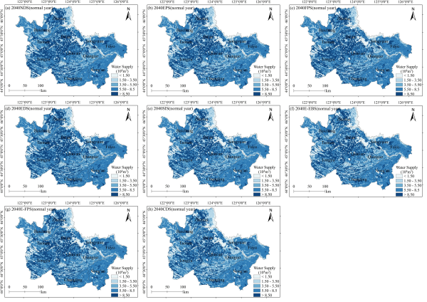 中國科學院東北地理與農業生態研究所科研人員選取了位于東北蘇打鹽堿集中分布區的吉林省西部,通過Plus模型設計了8種不同發展情景以探索符合吉林省西部未來土地利用規劃,并結合水文模型與作物系數法,在考慮枯水年和平水年的情況下,系統對比分析了2040年鹽堿地開發情景與其他7種發展情景下農業水資源供需的變化。研究結果表明:(1)通過有效的土地整治和改良措施,吉林省西部的鹽堿地問題有望得到顯著改善。特別是在鹽堿地改良情景和綜合發展情景中,到2040年鹽堿地面積將分別減少1188 km2和1709 km2(圖1、圖2)。(2)在傳統灌溉模式下,未來農業水資源供應(31.89×108~36.95×108m3)(圖3、圖4)無法滿足農業水資源需求(44.6×108~87.28×108m3)(圖5、圖6),枯水年份缺水的矛盾尤為突出。(3)農業水資源供需不平衡最嚴重的區域主要集中在水稻種植區(圖7)。高耗水作物種植面積的擴大將進一步加劇灌溉用水的壓力。在土地利用和降水變化的共同作用下,水資源供給的復雜性進一步加劇。本研究提出構建深度耦合的氣候-土地-水文模型,以應對未來氣候變化下農業水資源的挑戰,并通過構建“節水灌溉-種植結構優化-供水工程保障”治理模式,實現水資源高效利用和鹽堿地可持續開發的協同目標。研究可為吉林省“大水網工程”建設提供理論和技術支撐。