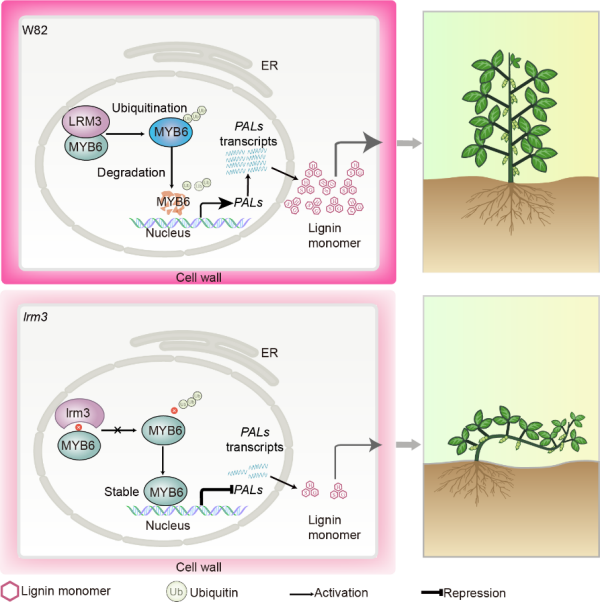 中國科學(xué)院東北地理與農(nóng)業(yè)生態(tài)研究所馮獻(xiàn)忠研究團(tuán)隊(duì)通過大規(guī)模篩選大豆突變體庫,分離到倒伏突變體lodging-related mutant 3(lrm3),與野生型相比,lrm3突變體的莖稈中木質(zhì)素含量下降80%,莖稈強(qiáng)度下降60%。通過圖位克隆技術(shù),克隆了控制倒伏表型的目的基因LRM3,該基因編碼一個(gè)U-box型E3泛素連接酶。進(jìn)一步實(shí)驗(yàn)證明,LRM3可以通過26S蛋白酶體途徑促進(jìn)MYB6蛋白的降解來提高大豆的抗倒伏性;MYB6蛋白直接結(jié)合在木質(zhì)素合成限速酶—苯丙氨酸解氨酶PAL1/2的啟動(dòng)子上抑制其表達(dá),從而降低木質(zhì)素的合成,降低大豆抗倒伏性。這項(xiàng)研究發(fā)現(xiàn)了調(diào)控大豆莖稈強(qiáng)度的LRM3-MYB6-PALs的分子模塊,為大豆抗倒伏性狀的分子育種提供了重要的分子靶標(biāo)。