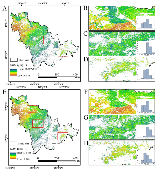 圖2. 吉林省土壤有機質(SOM)空間分布全局與局部回歸模型預測結果比較。A:全局回歸模型預測的SOM空間分布圖。B~D:A圖中選取的典型區域。E:局部回歸模型預測的SOM空間分布圖。F~H:E圖中選取的典型區域。B~D和F~H圖中的條形圖分別表示各區域內不同SOM含量的比例