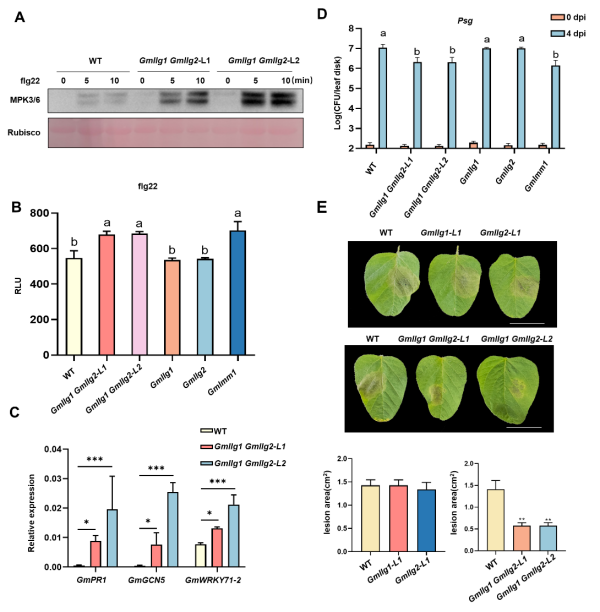 實驗室前期研究篩選到免疫自激活突變體Gmlmm1(lesion mimic mutant),它編碼一個CrRLK1L蛋白,調控免疫受體GmFLS2與GmBAK1結合,抑制免疫過度激活。本研究發(fā)現(xiàn)大豆GmLLG1/2與GmLMM1協(xié)同調控大豆免疫和抗病性,Gmllg1 Gmllg2突變體免疫和抗病性增強,GmLLG1/2調控GmLMM1的細胞膜定位,進一步研究發(fā)現(xiàn)小肽GmRALF1和GmRALF18可以負調控免疫,并可以與GmLLG1/2互作。Gmllg1 Gmllg2抗性增強的同時產量相關農藝性狀不受影響。本研究不僅深化了對大豆免疫機制的理解,也為培育抗病高產大豆新品種提供了新的基因資源。
