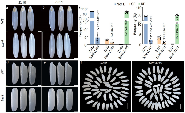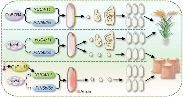 該研究首次發(fā)現,OsBZR4是調控無胚水稻的關鍵基因,在不同栽培品種中突變該基因均可產生60%-100%的無胚種子。OsBZR4特異表達于盾片-胚乳界面。進一步發(fā)現OsBZR4抑制YUC4和PIN5b的表達,通過調控早期發(fā)育種子中生長素含量和分布來發(fā)揮作用。外源施加生長素或過量表達YUC4均能提高水稻無胚率,而施用生長素運輸抑制劑NPA則降低無胚率。此外,高溫環(huán)境會顯著增加bzr4突變株系的無胚率,發(fā)現高溫能誘導OsPIL13基因表達,OsPIL13促進YUC4的轉錄,進一步增加生長素含量,從而解析高溫增加無胚率的機制。有意義的是,將bzr4等位突變導入優(yōu)良水稻品種中嘉10和中嘉11,在不影響水稻產量前提下,可提高精米產量和耐儲性。