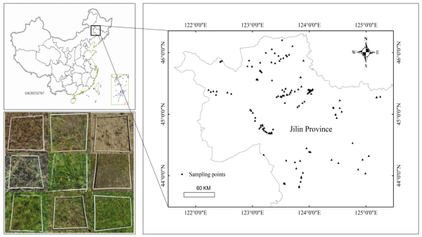圖1 吉林省西部采樣點位置及典型樣方調查照片