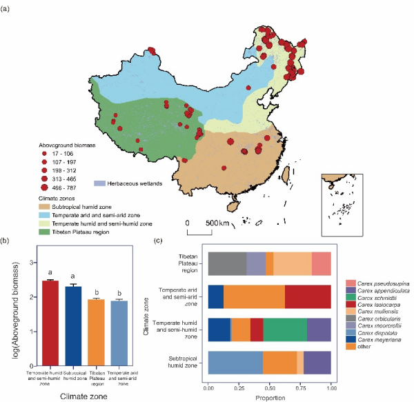 地上生物量是評(píng)估生態(tài)系統(tǒng)結(jié)構(gòu)與功能的關(guān)鍵指標(biāo)。莎草類(lèi)濕地(sedge wetlands)廣泛分布于全球溫帶沼澤和山地區(qū)域,具有固碳、維持生物多樣性和調(diào)節(jié)氣候等重要生態(tài)功能。然而,目前關(guān)于全國(guó)尺度莎草類(lèi)濕地地上生物量分布格局及其影響機(jī)制尚不清楚。明確莎草類(lèi)濕地地上生物量的空間分布及其生物和非生物影響機(jī)制,對(duì)預(yù)測(cè)濕地功能對(duì)未來(lái)環(huán)境變化的響應(yīng)至關(guān)重要。