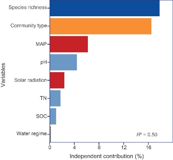 東北地理所科研人員結(jié)合國(guó)家濕地資源調(diào)查數(shù)據(jù)與遙感獲取的氣候信息數(shù)據(jù),以我國(guó)125個(gè)典型莎草類(lèi)濕地樣點(diǎn)為研究對(duì)象,明確了我國(guó)國(guó)家尺度濕地地上生物量的空間格局,分析了莎草類(lèi)濕地植物物種豐富度與地上生物量的關(guān)系,揭示了生物和非生物因素對(duì)地上生物量的貢獻(xiàn)及影響機(jī)制。研究結(jié)果表明,中國(guó)不同氣候區(qū)莎草類(lèi)濕地地上生物量具有顯著差異。非生物因子和生物因子共同影響莎草類(lèi)濕地地上生物量。其中,生物因子在決定地上生物量分布格局中占主導(dǎo)地位。植物物種豐富度對(duì)地上生物量具有促進(jìn)作用,而地上生物量與物種豐富度的關(guān)系受群落類(lèi)型調(diào)控。此外,年平均降水量是影響莎草類(lèi)濕地地上生物量空間分布的最主要非生物因子,二者呈正相關(guān)關(guān)系。土壤性質(zhì)不僅直接影響地上生物量,還通過(guò)物種豐富度和群落類(lèi)型間接影響地上生物量。