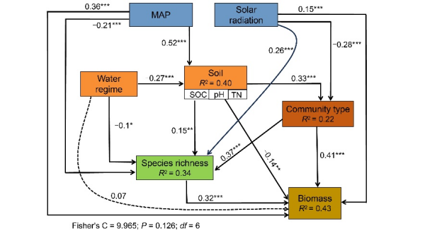 圖4 結(jié)構(gòu)方程模型揭示生物與非生物因子對(duì)中國(guó)莎草類(lèi)濕地地上生物量的影響路徑