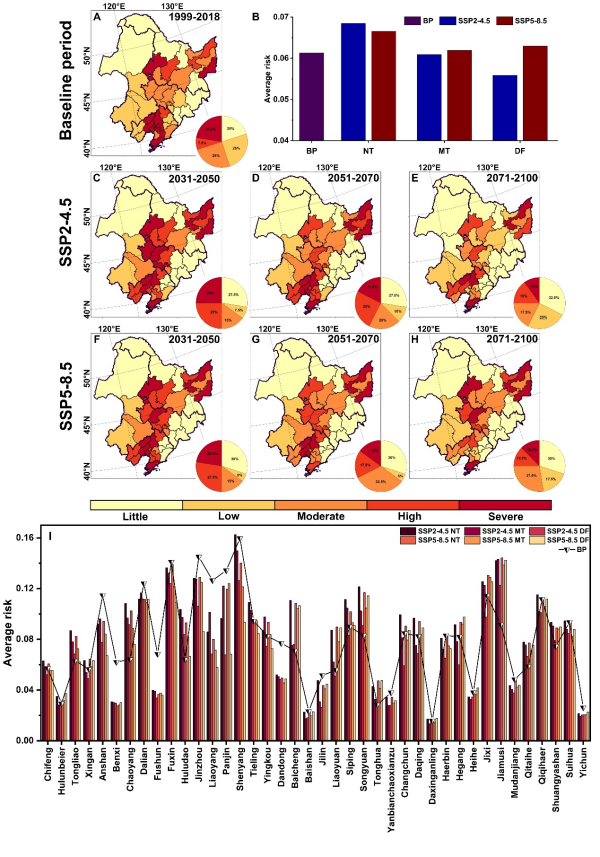 圖1. 不同氣候變化情景下東北黑土區(qū)的農(nóng)業(yè)水安全風(fēng)險(xiǎn)。A、C、D、E、F、G、H為不同時(shí)期水安全風(fēng)險(xiǎn)等級的空間分布;餅狀圖為各水安全風(fēng)險(xiǎn)等級在不同時(shí)期的面積占比;B為不同時(shí)期不同情景下的平均農(nóng)業(yè)水安全風(fēng)險(xiǎn);BP、NT、MT和DF分別代表基準(zhǔn)期、近期、中期和遠(yuǎn)期