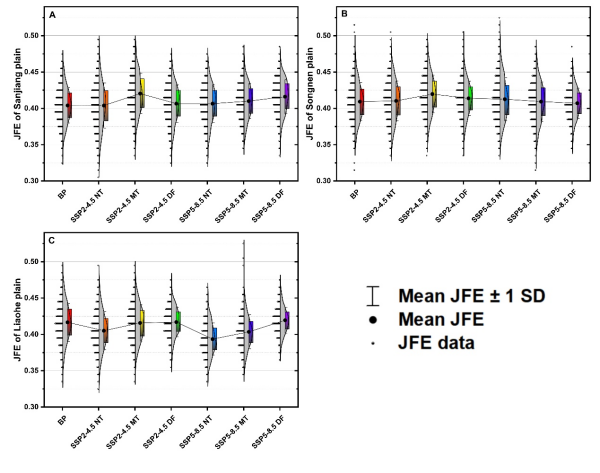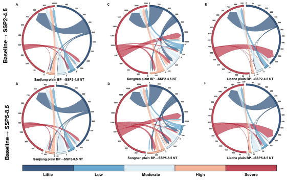 未來氣候變化下,洪澇將取代干旱成為威脅黑土糧倉農(nóng)業(yè)水安全的主要災(zāi)害。空間格局上,基準(zhǔn)期三大平原的洪澇特征表現(xiàn)為“遼河平原>松嫩平原>三江平原”;至未來中期(2051-2070),洪水災(zāi)害分布將發(fā)生空間逆轉(zhuǎn),形成“三江平原>松嫩平原>遼河平原”的新格局。