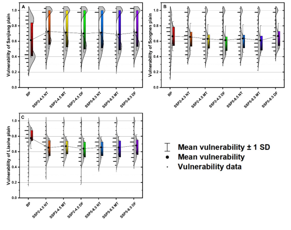 圖3. 未來氣候變化下三江平原(A)、松嫩平原(B)、遼河平原(C)農(nóng)業(yè)水安全脆弱性
