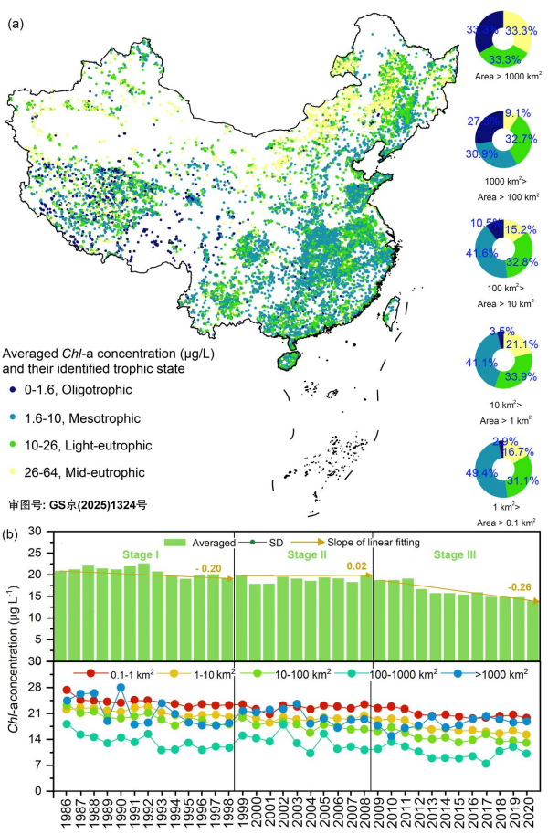 圖1 2020年中國湖泊葉綠素a均值估算結果及營養(yǎng)狀態(tài)分級(a)和1986-2020年不同湖泊面積中國湖泊葉綠素a均值變化趨勢