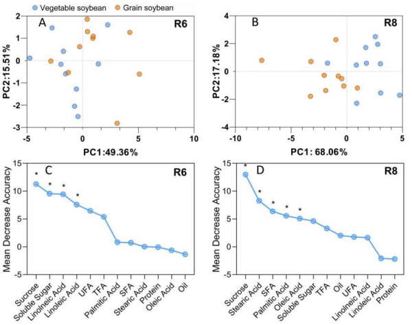 本研究選取了10個(gè)鮮食大豆和10個(gè)粒用大豆品種(系),對(duì)其營(yíng)養(yǎng)成分進(jìn)行了全面比較。研究發(fā)現(xiàn),鮮食大豆在蔗糖、可溶性糖和粗蛋白含量上顯著高于粒用大豆,而在粗脂肪和總脂肪酸含量上則相對(duì)較低。在鮮莢階段,鮮食大豆含有較高比例的不飽和脂肪酸,尤其是油酸。通過主成分分析(PCA)和機(jī)器學(xué)習(xí)算法,發(fā)現(xiàn)鮮食大豆和粒用大豆在營(yíng)養(yǎng)組成上存在明顯差異,并且蔗糖是區(qū)分鮮食大豆和粒用大豆的最關(guān)鍵營(yíng)養(yǎng)標(biāo)志物(圖1)。