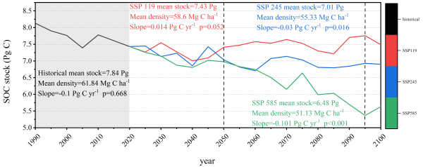 研究結果表明:(1)東北地區(qū)歷史碳損失明確,1985-2020年間,東北黑土區(qū)表層SOC密度平均下降5.51 Mg C/ha,整體呈現(xiàn)“碳源”效應。(2)未來命運取決于排放路徑, 到2100年,在高排放路徑(SSP585)下,SOC儲量將持續(xù)流失1.8 Pg;而在低排放路徑(SSP119)下,SOC儲量則有望小幅增加0.058 Pg,并出現(xiàn)多次碳匯/碳源轉(zhuǎn)換的動態(tài)波動。(3)耕地與林地是調(diào)控關鍵,未來SOC變化由耕地和林地主導。耕地擴張與管理不善是導致碳損失(碳匯轉(zhuǎn)碳源)的主要因素,而林地的保護與恢復則是促進碳回收(碳源轉(zhuǎn)碳匯)的關鍵。高碳儲量的生態(tài)系統(tǒng)(如林地、草地)對氣候變化更為敏感,面臨更高的碳損失風險。這項研究不僅量化了不同發(fā)展路徑下黑土碳庫的響應,更指明了生態(tài)恢復與土地管理在維持碳平衡中的決定性作用。