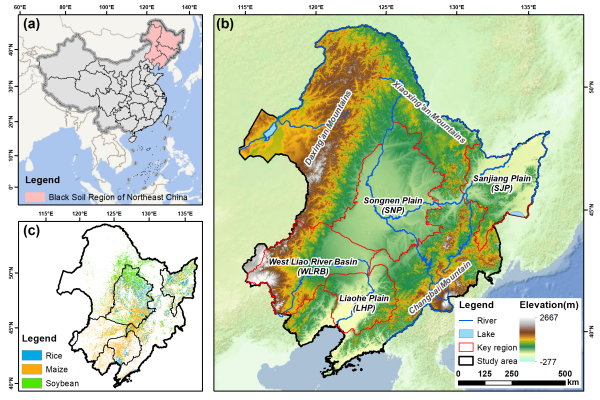 圖1 研究區及重點區域圖(a. 東北黑土區位置圖;b. 重點區域分布圖;c. 東北黑土區糧食種植分布圖)