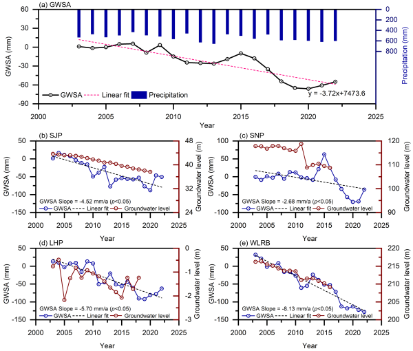 圖2 東北黑土區及重點區域地下水儲量(GWSA)年際變化趨勢圖(a.總體變化趨勢;b.三江平原;c.松嫩平原;d.遼河平原;e.西遼河流域)