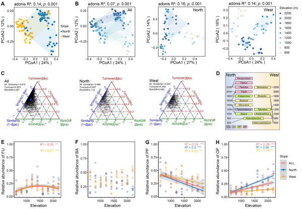 土壤線蟲在山地生態(tài)系統(tǒng)中發(fā)揮著重要生態(tài)功能,但其在不同海拔梯度上的分布格局及群落組裝機(jī)制仍存在諸多未解之處。針對(duì)這一科學(xué)難題,土壤物質(zhì)循環(huán)學(xué)科組等研究團(tuán)隊(duì)以長(zhǎng)白山北坡和西坡為研究區(qū)域,共采集108份土壤樣品,覆蓋九個(gè)海拔高度(600-2200 m)。系統(tǒng)分析了線蟲總體群落及不同營(yíng)養(yǎng)類型群落的空間相似性與組裝過程,并量化評(píng)估了海拔、環(huán)境距離和地理距離對(duì)群落空間變異及組裝機(jī)制的相對(duì)貢獻(xiàn)。