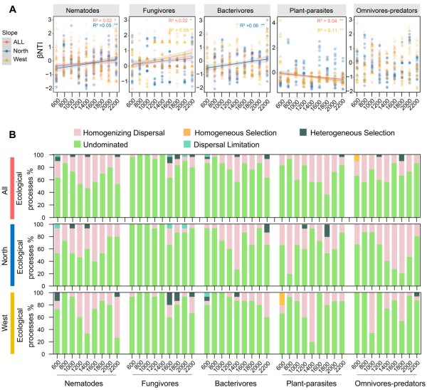 結(jié)果表明,物種更替是長(zhǎng)白山海拔梯度上線蟲群落組成變化的主要驅(qū)動(dòng)因素。群落結(jié)構(gòu)沿海拔梯度呈顯著分異:低海拔區(qū)(600-1000 m)以植物寄生線蟲為主導(dǎo),中海拔區(qū)(1200-1600 m)以食真菌線蟲為主導(dǎo),高海拔區(qū)(1800-2200 m)則以雜食性—捕食性線蟲占優(yōu)勢(shì)。總體來看,隨機(jī)過程在山體、北坡與西坡上線蟲群落及營(yíng)養(yǎng)群體的組裝中占主導(dǎo)地位,主要表現(xiàn)為擴(kuò)散限制和選擇作用較弱的情形。地理距離是影響線蟲群落組成與組裝機(jī)制的關(guān)鍵因素,但其與海拔及環(huán)境因子的相對(duì)貢獻(xiàn)在不同營(yíng)養(yǎng)群體間存在差異。