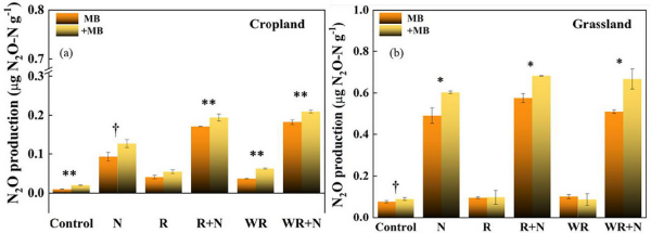 為破解這一科學(xué)難題,研究團(tuán)隊(duì)選取了源自同一母質(zhì)但土壤基質(zhì)存在差異的農(nóng)田土壤和草地土壤,通過葡萄糖預(yù)培養(yǎng)調(diào)控微生物量大小,隨后添加不同碳氮比的黑麥草殘?bào)w(低碳氮比)和熱水浸提黑麥草殘?bào)w(高碳氮比),并設(shè)置施氮與不施氮處理,探究了微生物量大小、外源碳氮輸入對不同土地利用類型N?O排放的影響。研究發(fā)現(xiàn),在無外源碳氮輸入條件下,微生物量的增加使農(nóng)田土壤和草地土壤的N?O排放量分別提升 105% 和 18%,證實(shí)了微生物量大小是調(diào)控N?O排放的關(guān)鍵因子(圖1)。不同土地利用類型對碳氮輸入的響應(yīng)存在顯著差異:農(nóng)田土壤中,高碳氮比黑麥草殘?bào)w與施氮結(jié)合處理的N?O排放量最高;而草地土壤則在低碳氮比黑麥草殘?bào)w與施氮組合下排放量最大。